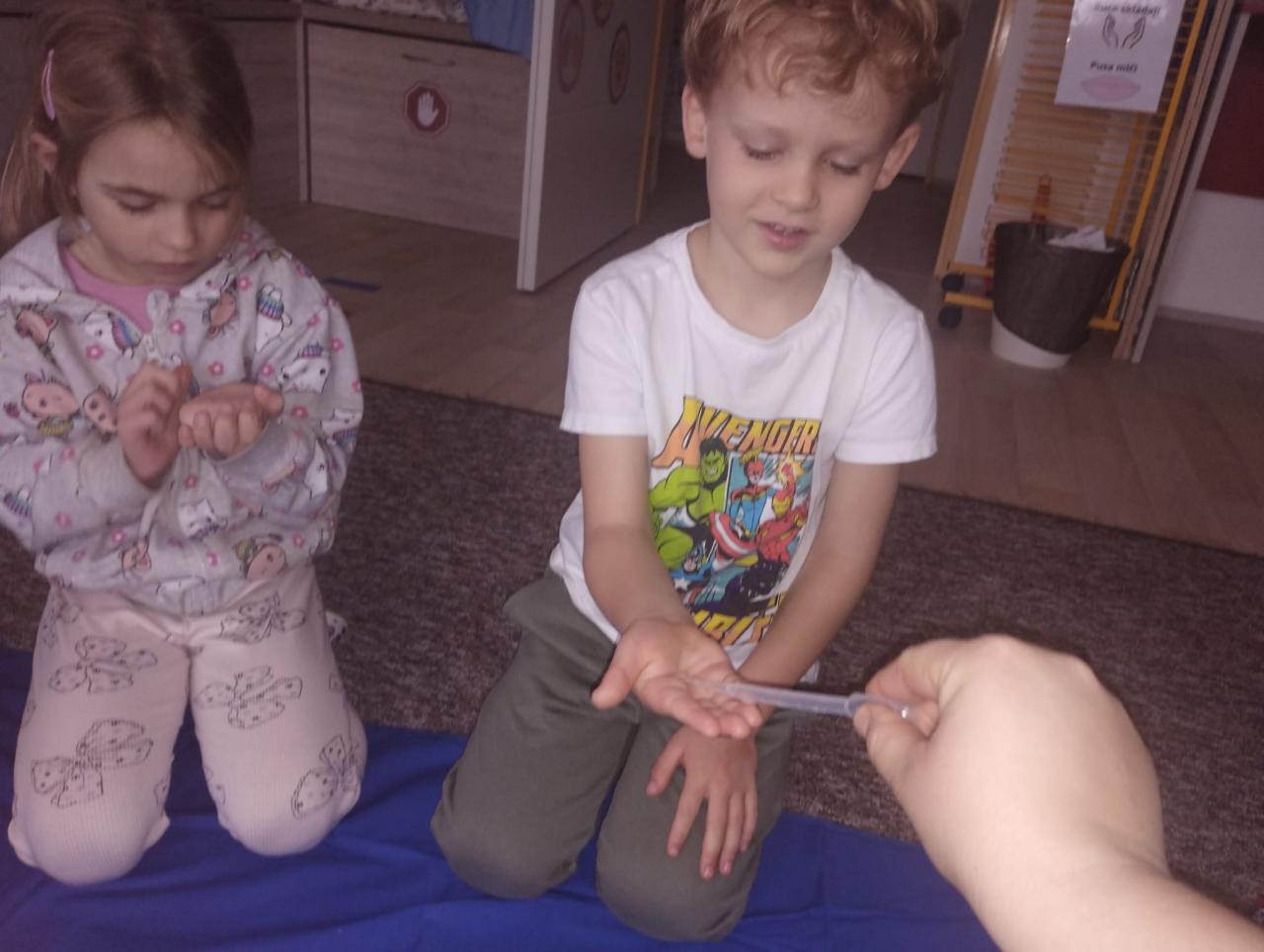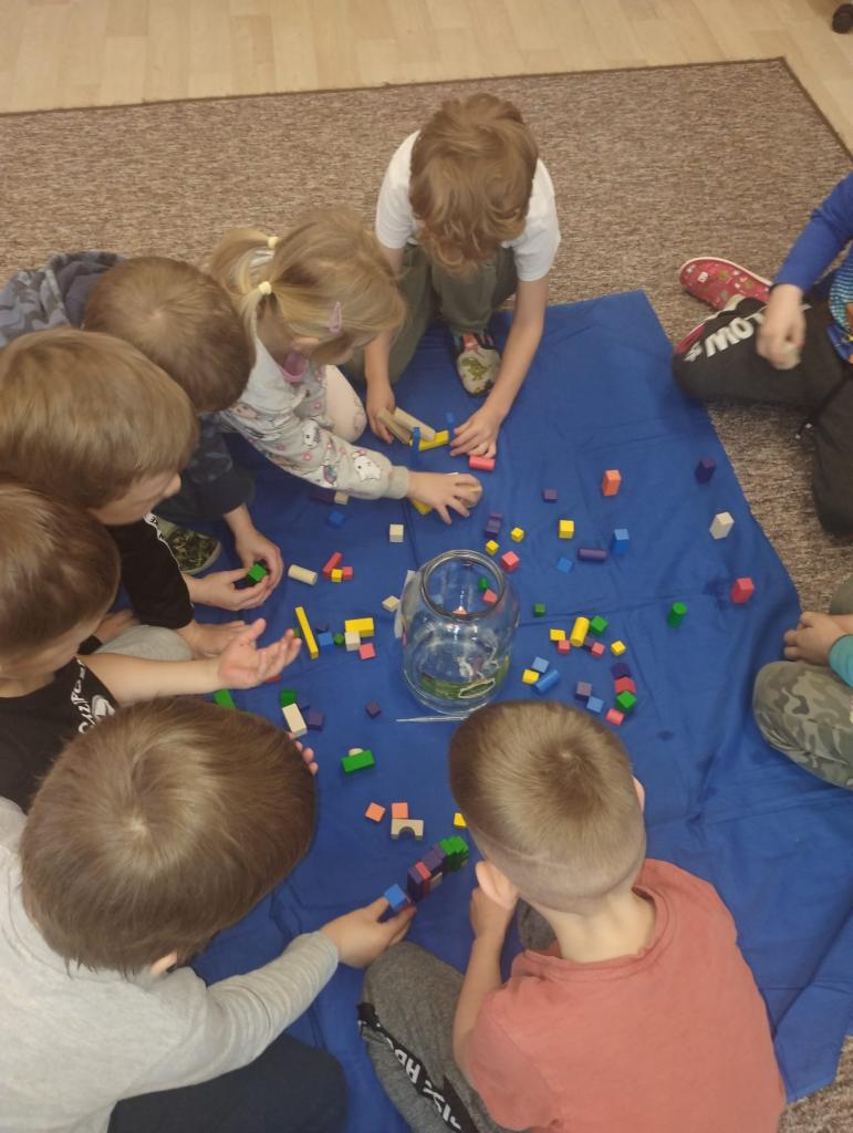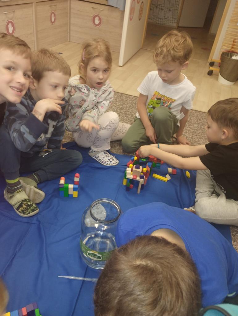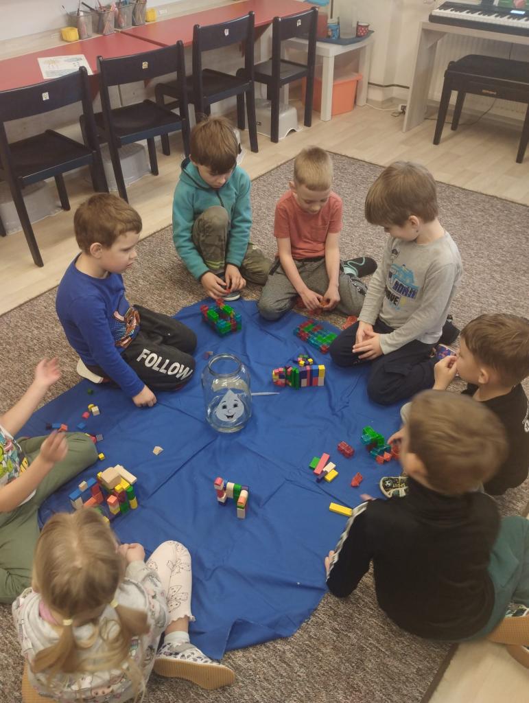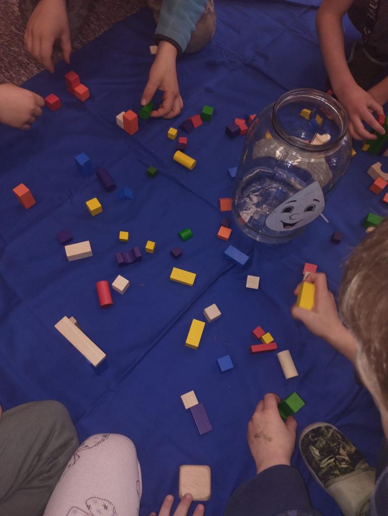 Děti dnes čekalo malé tajemství – pod plachtu se skrýval neznámý předmět, který měly uhodnout podle tvaru. Po chvilce napínání jsme hadru odhalili a objevila se kapka Bruzovka ve velké sklenici, která se stala průvodkyní celého dopoledne. Každé dítě dostalo svou malou kapičku do dlaně a společně jsme si povídali o tom, kde všude se voda v našem světě nachází, proč je pro život tak důležitá a co znamená koloběh vody. Poté děti poslouchaly krátký příběh o kapce Bruzovce, která cestovala kolem známých míst ve vesnici – kolem kostela, školy, zastávky, haly, obecního úřadu i myslivecké chaty – a učila se, že i malá kapka může urazit velkou cestu. Na závěr si děti z připravených kostek stavěly budovy, které kapka na své pouti potkala, a společně tak vytvořily malou mapu Bruzovic plnou fantazie a dětské radosti.