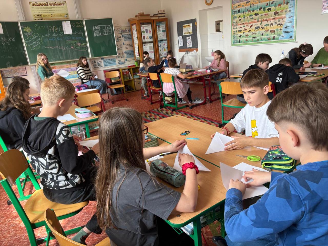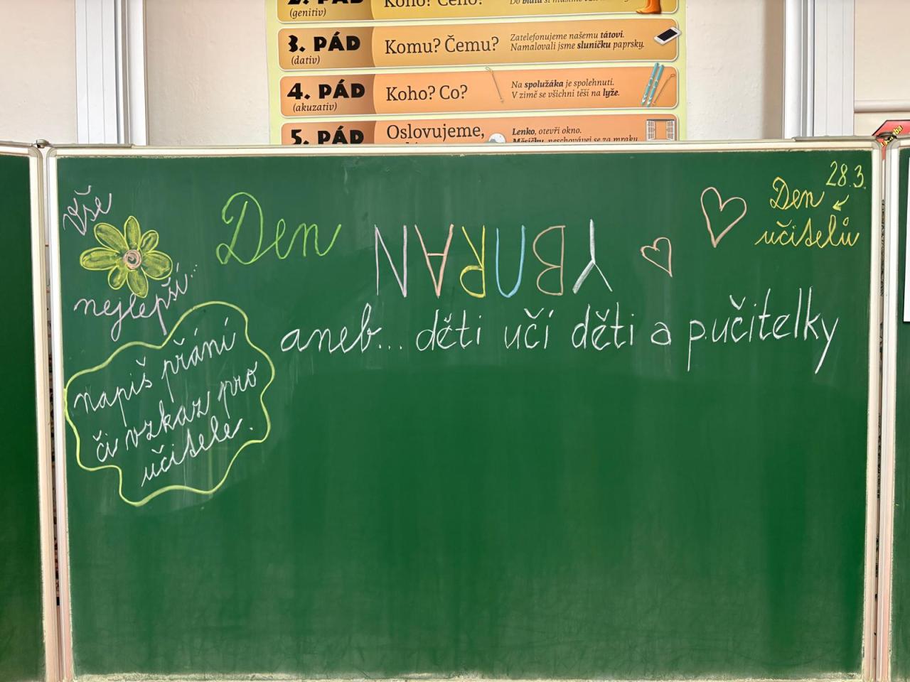 Den naruby. a tak to dnes ve škole vypadalo jinak. Děti učily děti i učitele. Vyzkoušely, jaké to je postavit se před třídu a něco děti naučit. I když někdo neposlouchá, je hluk nebo prostě nechtějí pracovat. Na konci dne si děti uvědomily, že je to opravdu velmi těžké a že by tedy nechtěly být učiteli. Tedy skoro všechny děti. Nechyběl Aprílový žertík, ale prokoukli nás. Máme velkou radost, že se děti nelehkého úkolu zhostily pěkně.