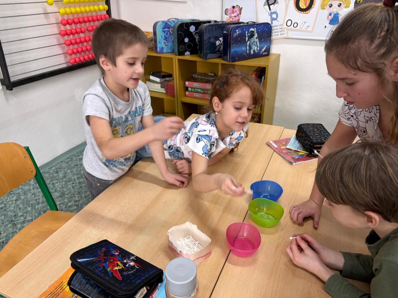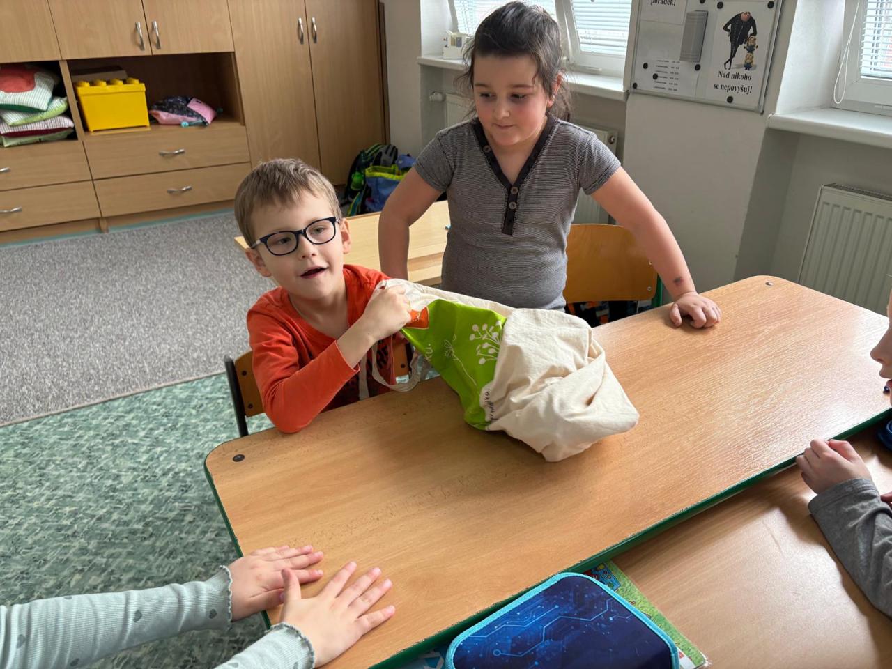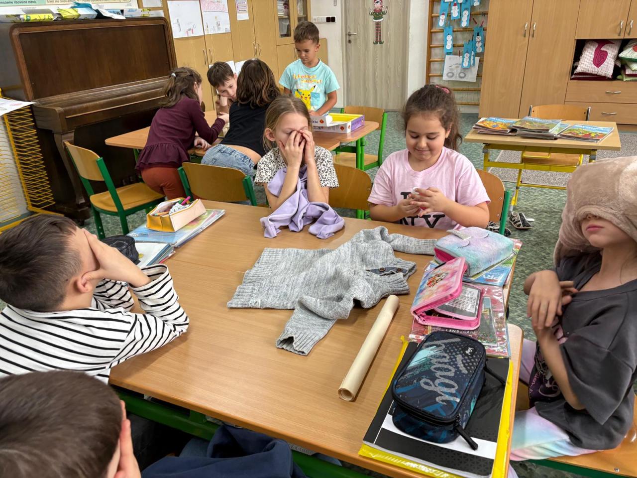Učivo o těle si děti v prvouce zpestřily prožitkovou hodinou. Nejprve mladší děti představily starším, jaké smysly máme a co jimi vnímáme. Pak všichni pracovali v sešitech, kde využili své nabyté znalosti a následovala práce na stanovištích.