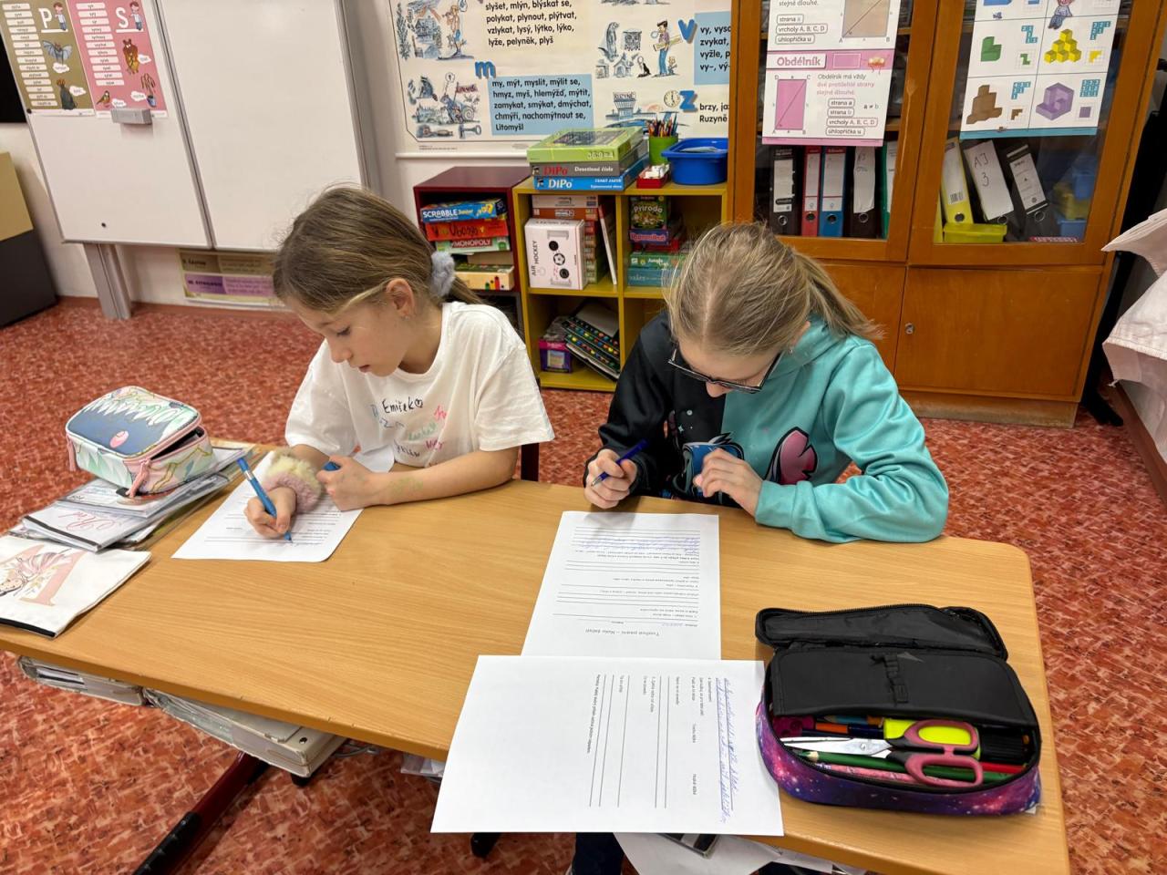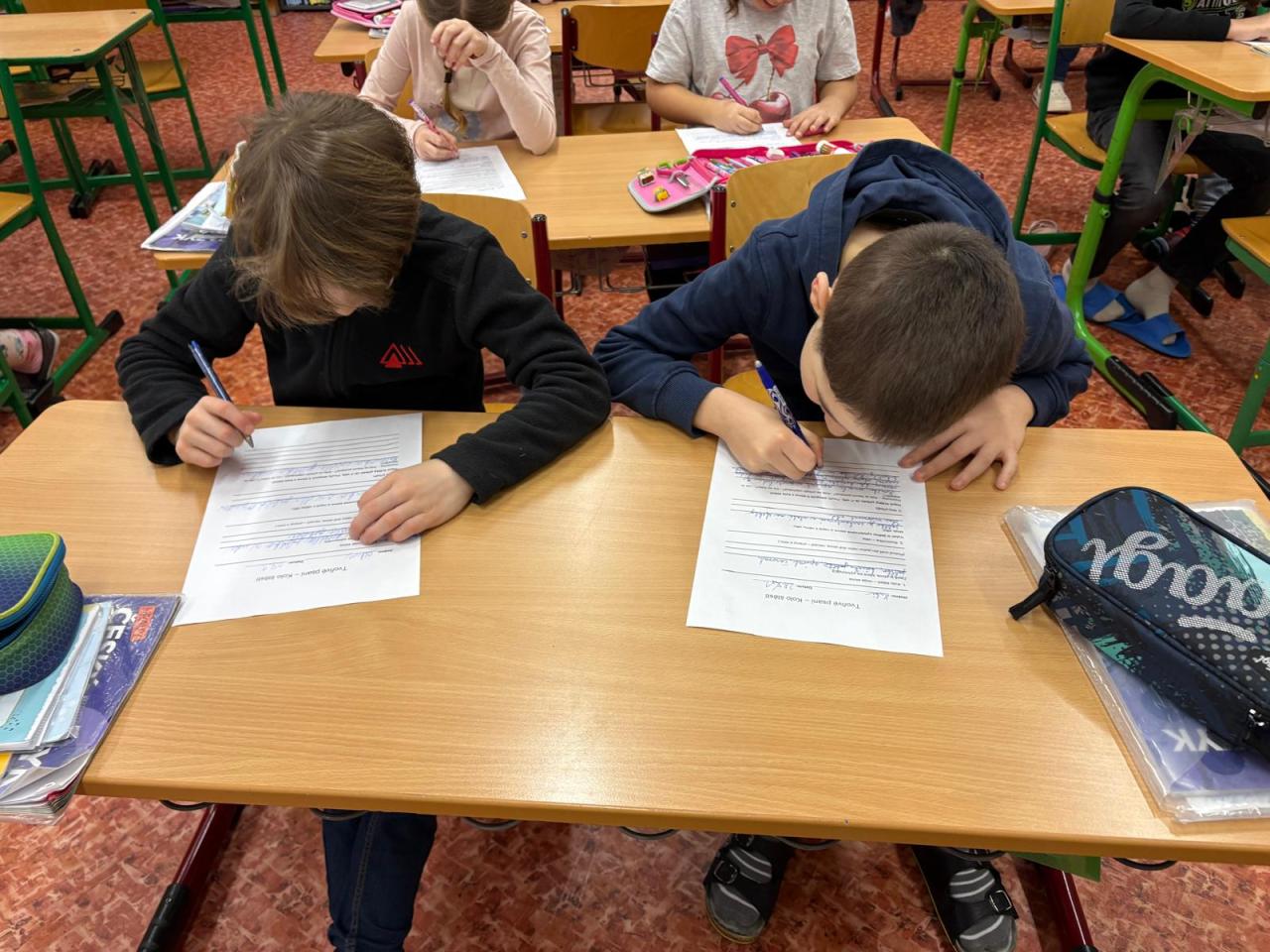 Ve třetím a čtvrtém ročníku si děti ve slohu zkouší všelijaké aktivity. Tentokrát psali vyprávění na základě vylosovaných slov z kola štěstí. Úkolem bylo vytočit si tři slova. S jedním vytvořit větu a se všemi třemi příběh. Co myslíte? Jak to dopadlo? Máme pěkné příběhy.